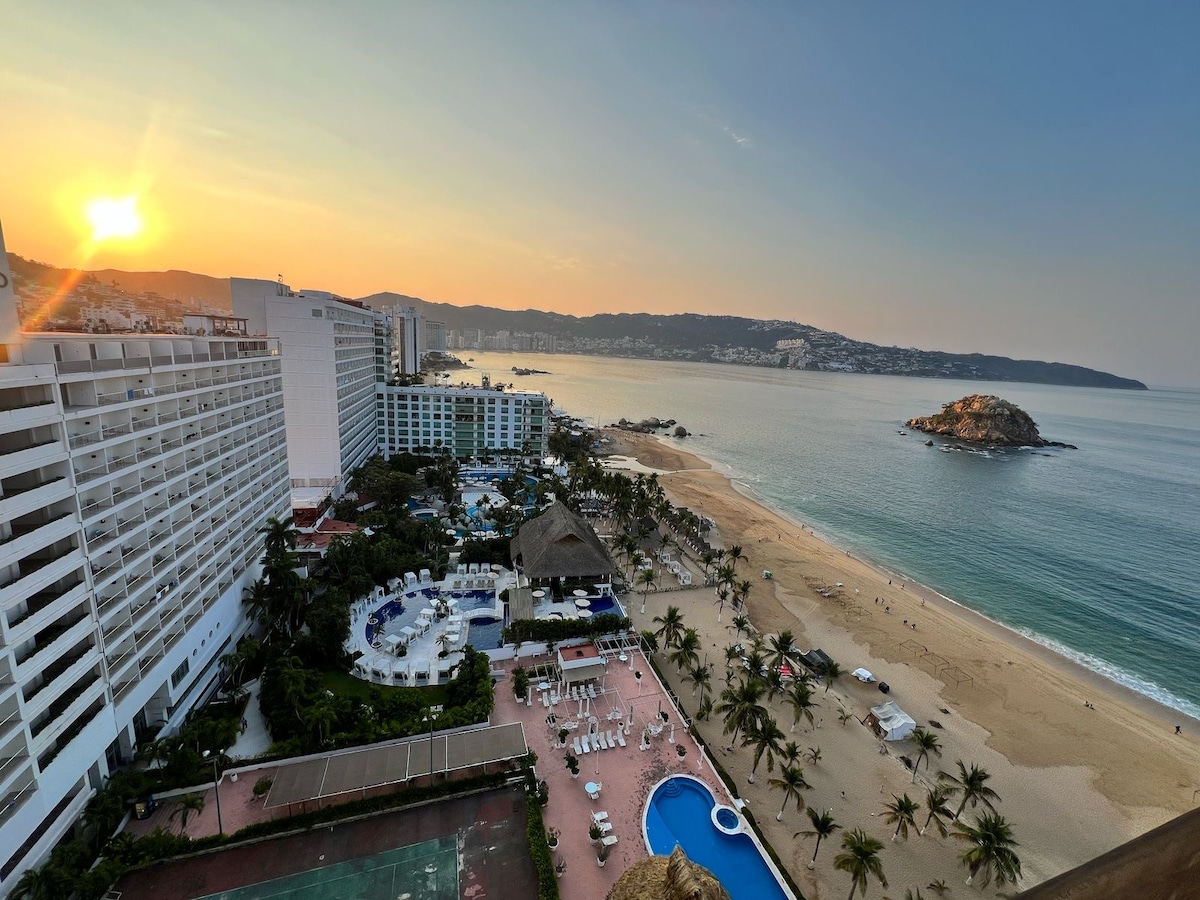 Magnifica vista panorámica de la bahía de Acapulco, localizado en el piso 24 de las Torres Gemelas Acapulco, con acceso a playa privada, area de albercas, vigilancia las 24 horas. Espacio cómodamente amueblado para 4 personas, cocineta integral, muebles de interior y exterior, TV plana , refrigerador, horno de microondas, tostador de pan, cafetera de capsulas, secadora de pelo, plancha, toallas de alberca y toallas de baño incluidas.