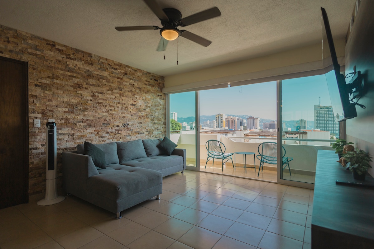 Estoy seguro de que este es tu lugar perfecto! Hospedate en este moderno y elegante loft ideal para una familia de hasta 5 personas Este espacio está pensado para tener una vista increíble al mar disfrutando de todas las comodidades de un hogar Cerca encontraras todos los comercios necesarios como gasolinera, tiendas de autoservicio, restaurantes, bares, antros, en fin, estarás hospedado en la zona más vibrante de Acapulco No lo pienses más y vente a Aca.