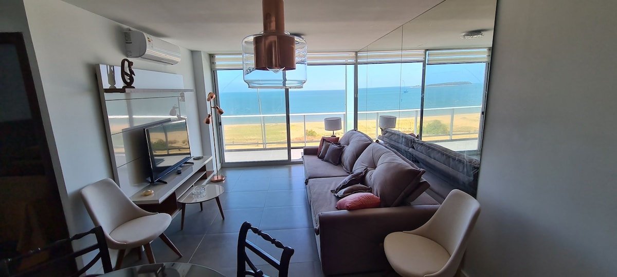 Precioso apartamento con vistas al mar a 120 metros de la playa, 1 dormitorio, living, baño, cocina y balcon, totalmente equipado y super comodo. El edificio cuenta con piscina climatizada interior con un jacuzzi , gimnasio, recepcion, dos piscinas exteriores y parrillero , un parrillero en la terraza con vista a la playa Mansa y la Brava y tambien parking. En una zona llena de restaurantes, mercados y mas. 😊