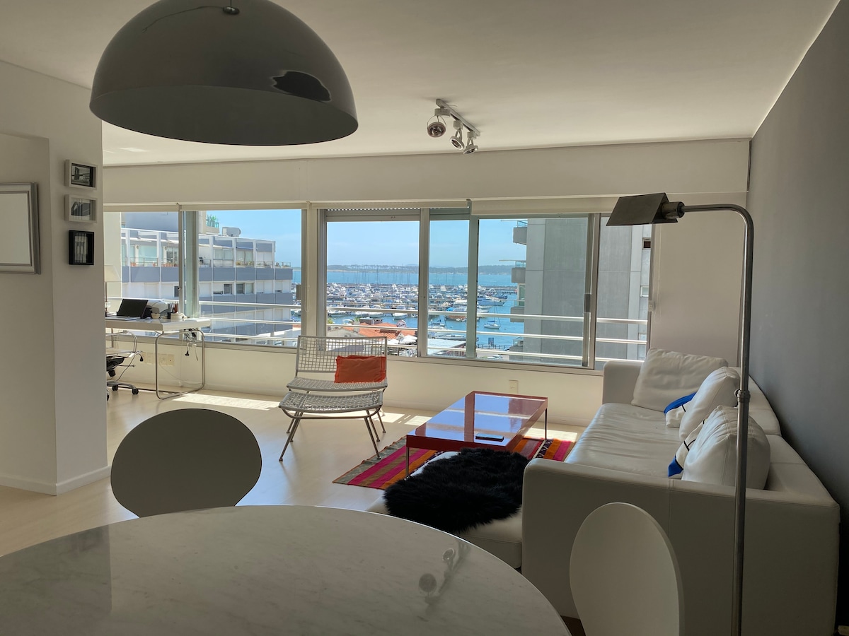 Edificio "Puerto", ed. emblemático de Punta del Este. Studio de 40 m2 sobre el Puerto, totalmente reciclado . Gran balcón. Cocina americana y baño completo, cama king size que se puede convertir en 2 camas twin. Free Wi Fi y SMARTtv con cable. Seguridad 24 hs. 2 ascensores. a 100 m. "playa de los Ingleses". A 400 m. playa Brava! Mi apartamento no tiene cochera.