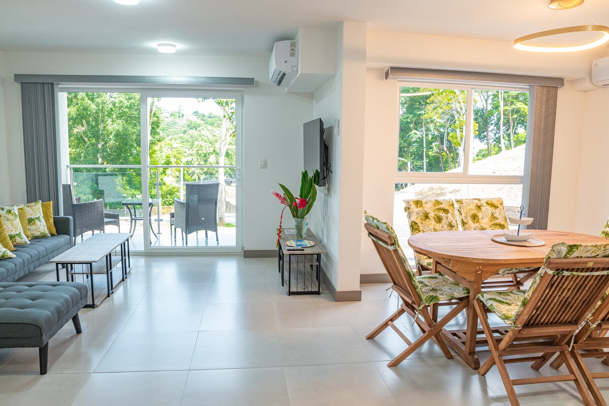 Remodeled apartment with contemporary decor, ideal for groups of 4, spectacular ocean and tropical forest views. Direct and private access to Playa Blanca. It includes a Master bedroom, with a king-size bed, and a queen sofa bed in the living room. Full AC, equipped with all appliances, dishwasher, microwave, oven, refrigerator, coffee maker, blender. It also includes cleaning. It also has high speed WI-FI. Telephone and cable TV. Located on a third floor without access to an elevator.