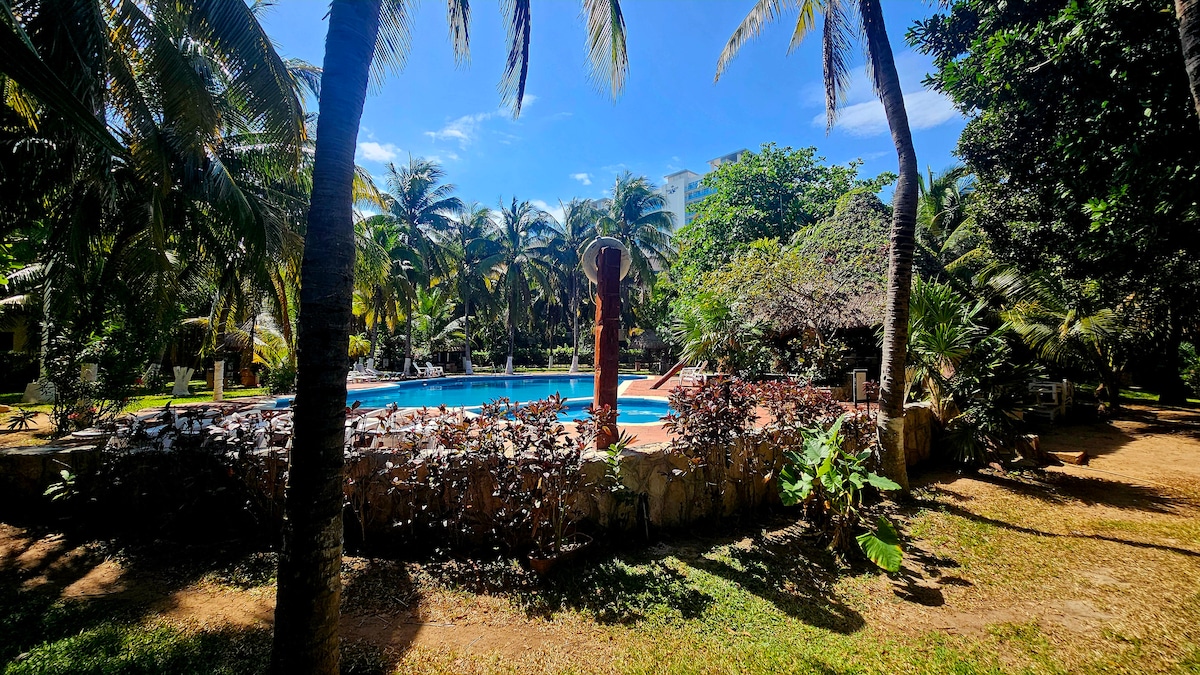 1 bedroom sleep 5. Equipped with 3 fans and 2 AC units. YOU PAY FOR THE ELECTRICITY you use APPROXIMATELY $4 DOLLARS A DAY OR if you leave A/C on all the time it could be $8 a day, not normal. Convenient, 2 level/ across from grocery store and police station on Cancun's most exclusive beach area minutes from everything! 3 pools, 24/7 security, parking, WIFI, equipped. Yes the best location and favorite beach.