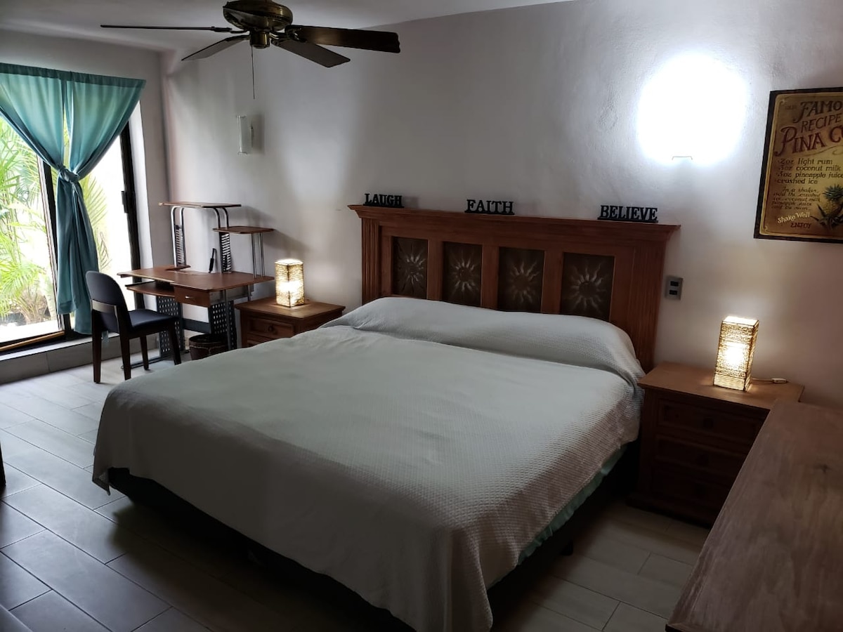 1 bedroom sleep 5. Equipped with 3 fans and 2 AC units. YOU PAY FOR THE ELECTRICITY you use APPROXIMATELY $4 DOLLARS A DAY OR if you leave A/C on all the time it could be $8 a day, not normal. Convenient, 2 level/ across from grocery store and police station on Cancun's most exclusive beach area minutes from everything! 3 pools, 24/7 security, parking, WIFI, equipped. Yes the best location and favorite beach.