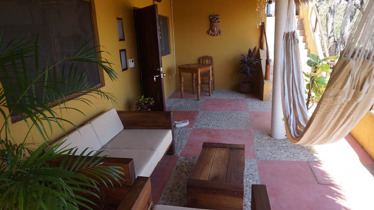 breezy safe bungalow on a hill surrounded by forest, has an ocean and punta cometa view, free parking and only 10 min walk from beach, shops, restaurants. It has hardwood floor, palm leaf roof, super comfy hammock on the balcony, many windows and it's completely lockable. You need to walk stairs to get in, this also keeps traffic noise away, we help with luggage with our ATV if necessary. We offer you endless drinking water and starlink internet.