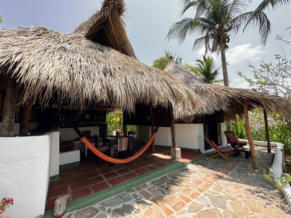 La Cabaña Rinconcito, unos pocos metros de la playa, tiene 2 camas matrimoniales, hamacas, WIFI, agua purificada, su propia cocina equipada, refri, y baño privado. Rodeado con los arboles, sus animalitos y pájaros, uno se siente parte de la naturaleza. Si te gusta acampar, esta rústica cabaña con su techo de palma será para tí. La recamara tiene un mosquitero sobre su cómoda cama, y también la cama abajo en la sala. Hay vista al mar desde las hamacas en la sala.