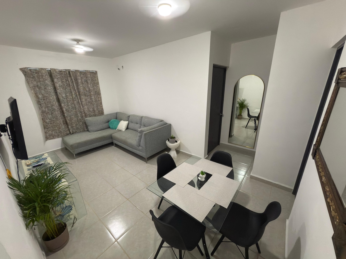 "Nuestro departamento esta a 5 minutos en carro de playa Miramar. Cuenta con cocina equipada con estufa, horno, licuadora, cafetera, utensilios básicos de cocina; Un baño completo con agua caliente. La habitación principal cuenta con MiniSplit, 1 camas matrimonial y una Queen sice y closet amplio. Otra habitación con una cama Quin Size (sin aire acondicionado) . Sala de estar con una pantalla de 40 pulgadas, WIFI, y tv por cable. terraza con asador, mesas y sillas.
