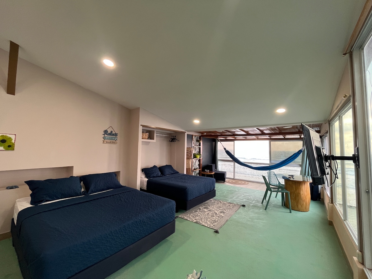¡Vive frente al mar! Esta hermosa mini suite se encuentra en el primer piso, y cuenta con dos niveles privados. 1er nivel: Cocina equipada, smart tv de 32”, nevera, baño con agua caliente, comedor/escritorio, wifi, y estacionamiento al exterior. 2do nivel: Balcón con mesa, hamaca, wifi y una hermosa vista a la playa y hacia las montañas. Los servicios de agua, electricidad e internet están incluidos. Servicios particulares: Clases de surf / lavandería / tours / movilidad al aeropuerto.