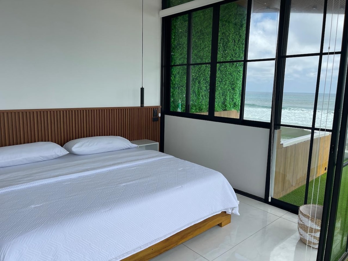 La suite combina elegancia, simplicidad y naturaleza, creando el ambiente perfecto para descansar, trabajar con tranquilidad o disfrutar de una escapada romántica en Olón. Al entrar, te recibe una sala luminosa con sofá amplio y detalles artesanales que crean una sensación de paz. La habitación principal cuenta con una cama King muy cómoda, iluminación cálida y un diseño natural en bambú que eleva la atmósfera de relajación.