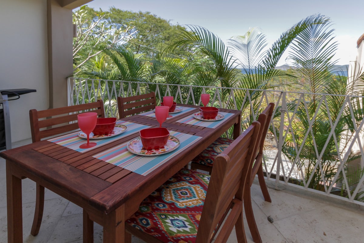 An awesome spot to relax.. or work. The terrace has shaded seating, fiber 100mbps internet, a BBQ & sink. Ocean views from every room except the bathroom. 350m (1050ft) to the beach with many restaurants and small shops along your way. There are 6 pools to choose from within the gated community complex, one poo To get to the beach it's a 5 min slow walk where you will find nice grassy spots for a picnic; or, take the other path and enter near Pacifico Beach Club where they have pools and bar