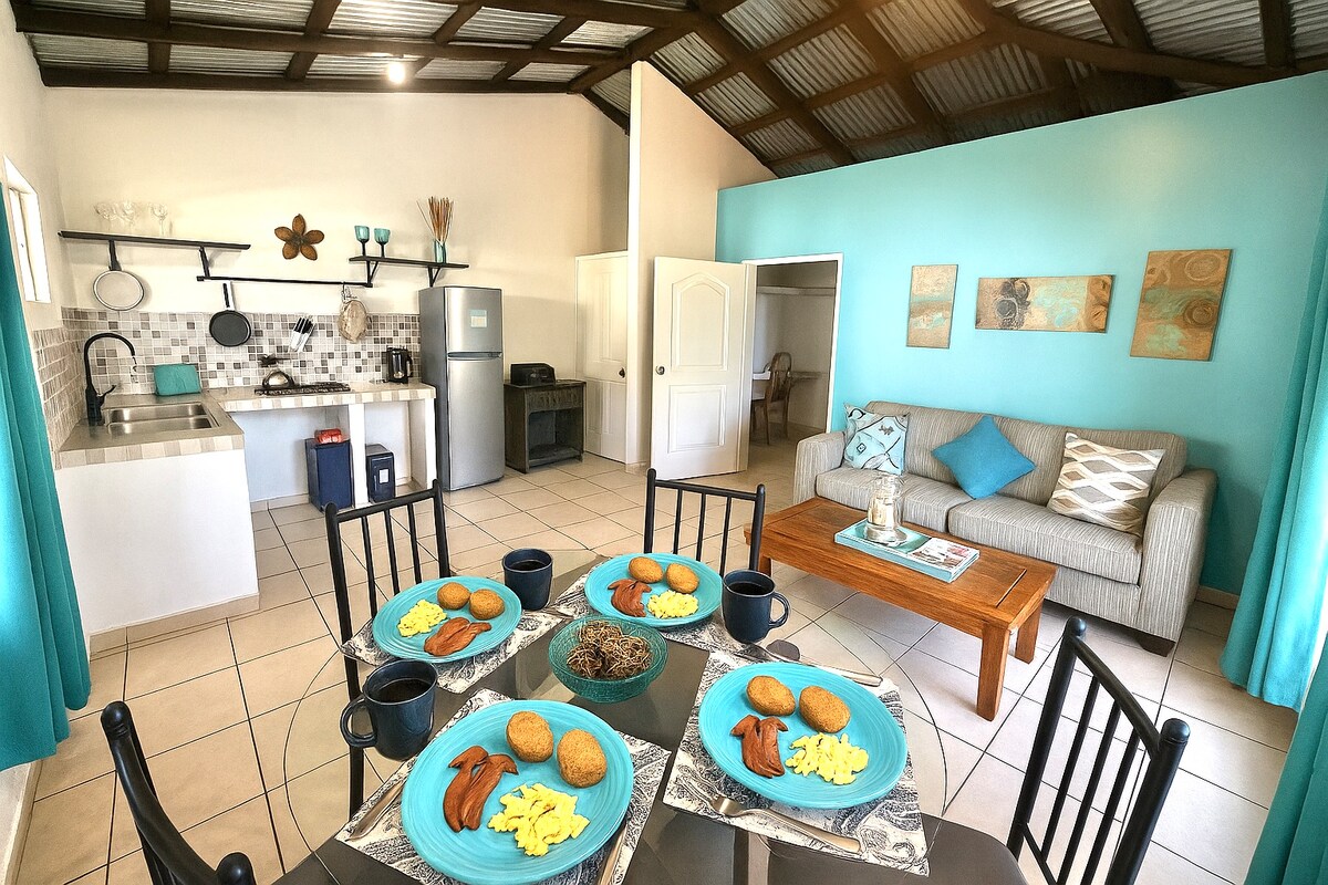 Welcome to your bright and breezy beach-inspired retreat! Relax in the open living area with a comfy sofa bed, dining space, and a fully equipped kitchen perfect for preparing delicious meals. Your private bedroom offers a cozy queen bed and a convenient en-suite bathroom. Stay cool with air conditioning and connected with free Wi-Fi. Step through the patio doors to a large covered balcony—an inviting space to sip coffee, unwind, or enjoy the tropical breeze after a fun day of exploring.
