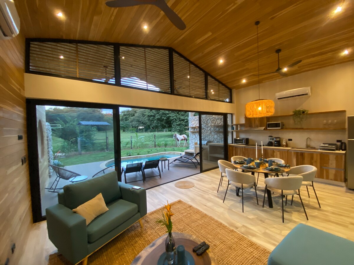 Nestled in the heart of the Costa Rican jungle, Banguni Villas is a peaceful retreat for couples or travelers seeking a slow escape. Surrounded by trees and wildlife, the villa offers a comfortable space with a spacious bedroom, modern amenities, and a strong connection to nature. The property includes only this villa and our home, set on the same land but well separated. Enjoy quiet mornings, relax by the shared saltwater pool, and visit nearby beaches like Playa Avellanas and Playa Negra.