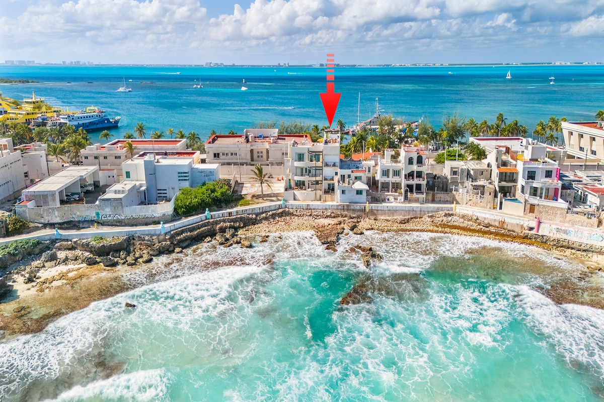Relaxing three-story waterfront home overlooking the Caribbean, directly on the Malecon walkway. 3 bedrooms, 4 bathrooms, living room and kitchen. Balconies with ocean views on each floor. Fabulous roof top patio with palapa seating, dining area, deep dipping pool and a 360 degrees view. Centro adjacent on the Caribbean Malecon just a few blocks from North Beach, ferry and restaurants but far enough away from the hustle & bustle. Sleeps 5 comfortably, up to 7. No pets please.