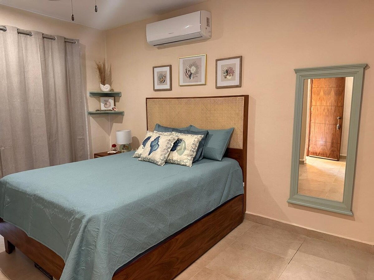 Cómodo y lindo departamento privado en zona tranquila de Isla Mujeres, ubicados justo en el medio de la isla a 10 minutos de la terminal marítima y a escasos pasos del andador del mar caribe. Te ofrecemos un espacio completamente pensado y equipado para ti, contamos con una cama matrimonial, aire acondicionado, Tv (en la habitación y en la sala), plancha de ropa, agua fría/caliente, cocinada equipada, refrigerador e internet.