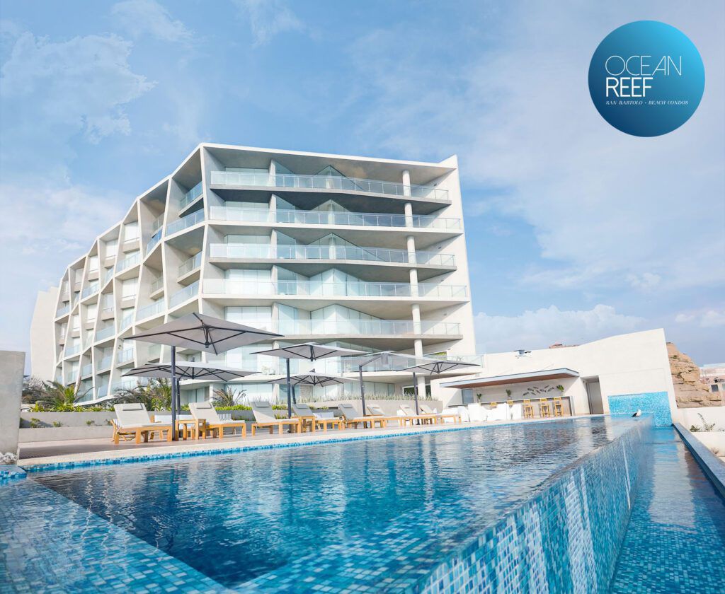 Departamento en Condominio Ocean Reef - San Bartolo. 3 dormitorios, 3 baños. Con vista al mar y a jardín interior, completamente amoblado y equipado con TVs y sistema de cine, equipo sonido, menaje, ropa de cama, cable, internet, streaming, hamaca, cochera, piscina ambiente bar, piscina familiar con zona de parrillas sauna, jacuzzi, gimnasio, yoga room, beach lockers. Salida a playa de arena a pocos pasos.