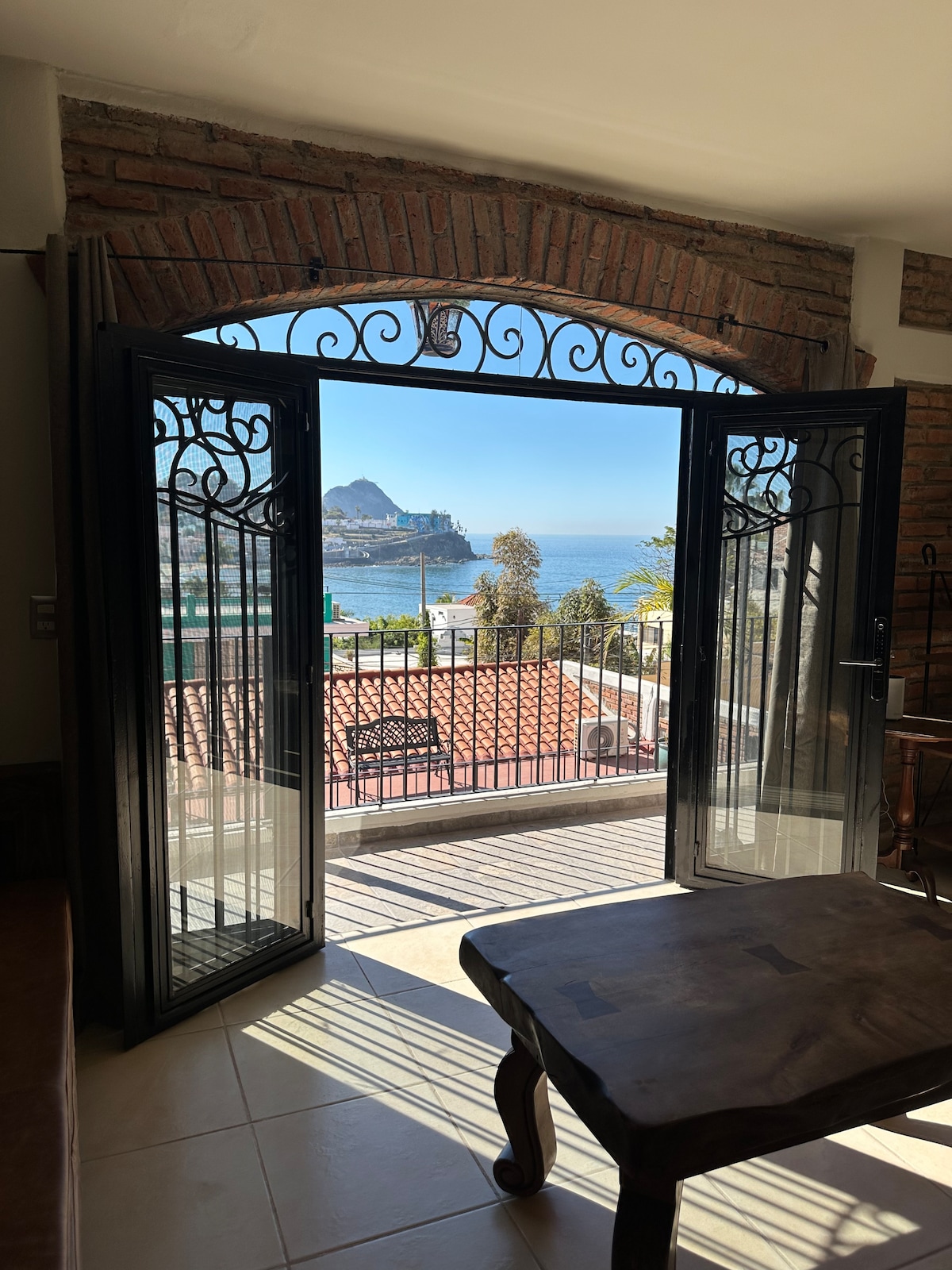 La Casa Del Capitan is an old Hacienda that has just been remodeled . It has six apartments that were named after my favorite islands in Mexico. Isla Espíritu Santo is a two bedroom with a kitchen and 2 1/2 bath. It features a beautiful marble table, wooden furniture, and leather couches .This apartment is on the third floor and has two sets of steps. Below is a barbecue and pool area. The best part It’s just a block from the beach and has an amazing view of the beach and Olas Altas.