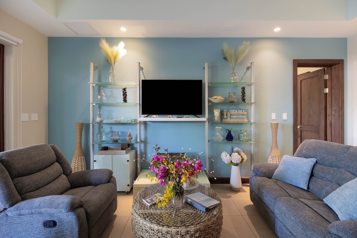 Enjoy a luxurious and unforgettable stay at our stunning 2-bed, 2-bath condo, featuring breathtaking ocean views. Both bedrooms offer premium bedding for a peaceful night's sleep. The dining/living area is bright and spacious, furnished with modern decor that exudes an airy atmosphere. Step onto the scenic balcony and soak in the magnificent views of Playas del Coco. Please note that the condo is located on the second floor, there are about 40 steps to access the unit with no elevator.