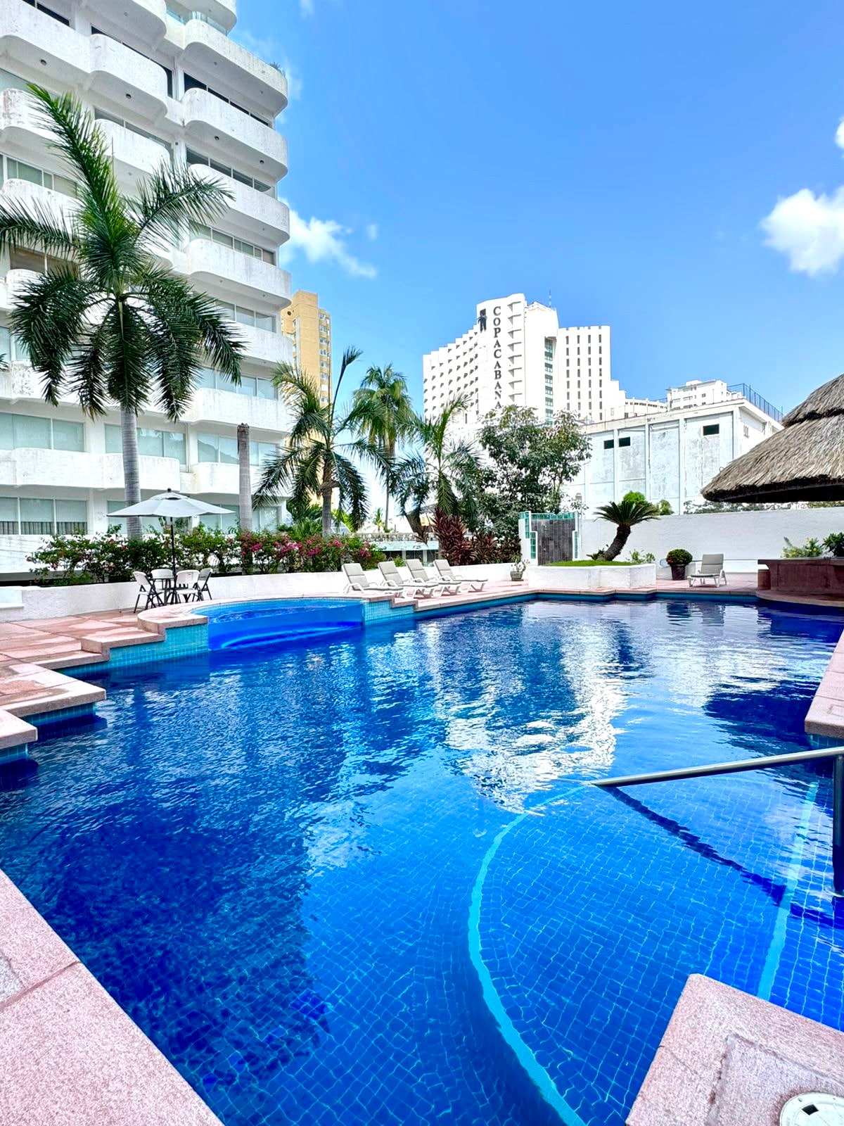 The interior of the apartment has no damage from OTIS and JOHN. Spacious 4-BR luxury beachfront apartment, EXCLUSIVE FOR FAMILIES, with a huge double balcony, stands out for its unbeatable view of the paradisiacal Acapulco Bay, large pool, and beach club. Includes daily maid service (hotel-style). 100 meters of beachfront with exclusive-use palapas, a pool with a slide, a wading area for kids, and restaurant/bar service. The 4 bedrooms have mini-splits and private bathrooms.