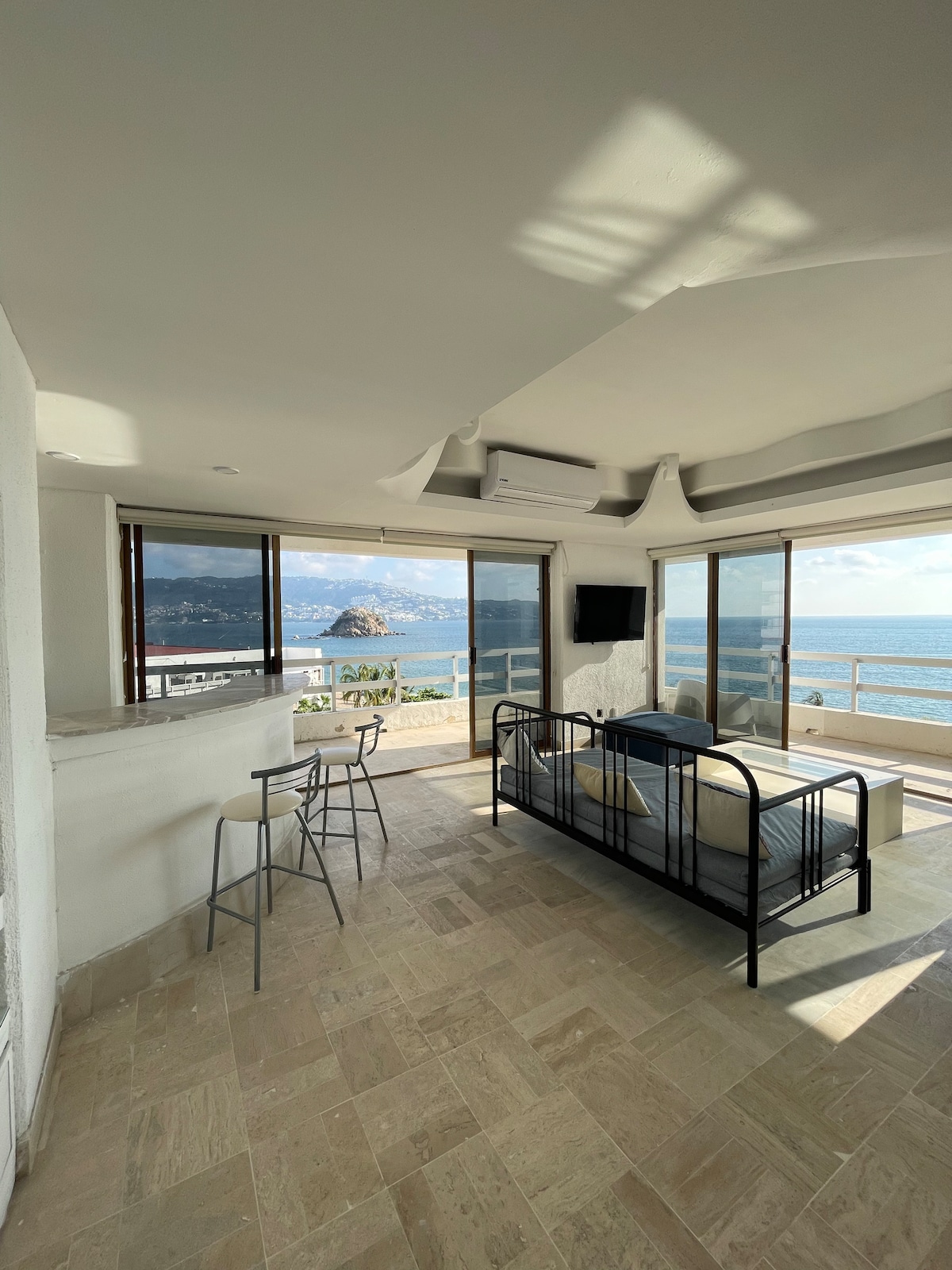 Pent House PET Friendly único en Acapulco con una vista a 360 grados. Alberca panorámica que permite gozar del show de los clavadistas de la Quebrada. Area de sala y comedor totalmente abierta hacia el exterior con terraza amplia. Cocina equipada y tres recamaras cómodas cada una con su respectivo baño. La decoración del PH es de estilo mediterráneo. El espacio goza de la ventilación natural de la brisa marina lo cual da una sensación de bien estar.