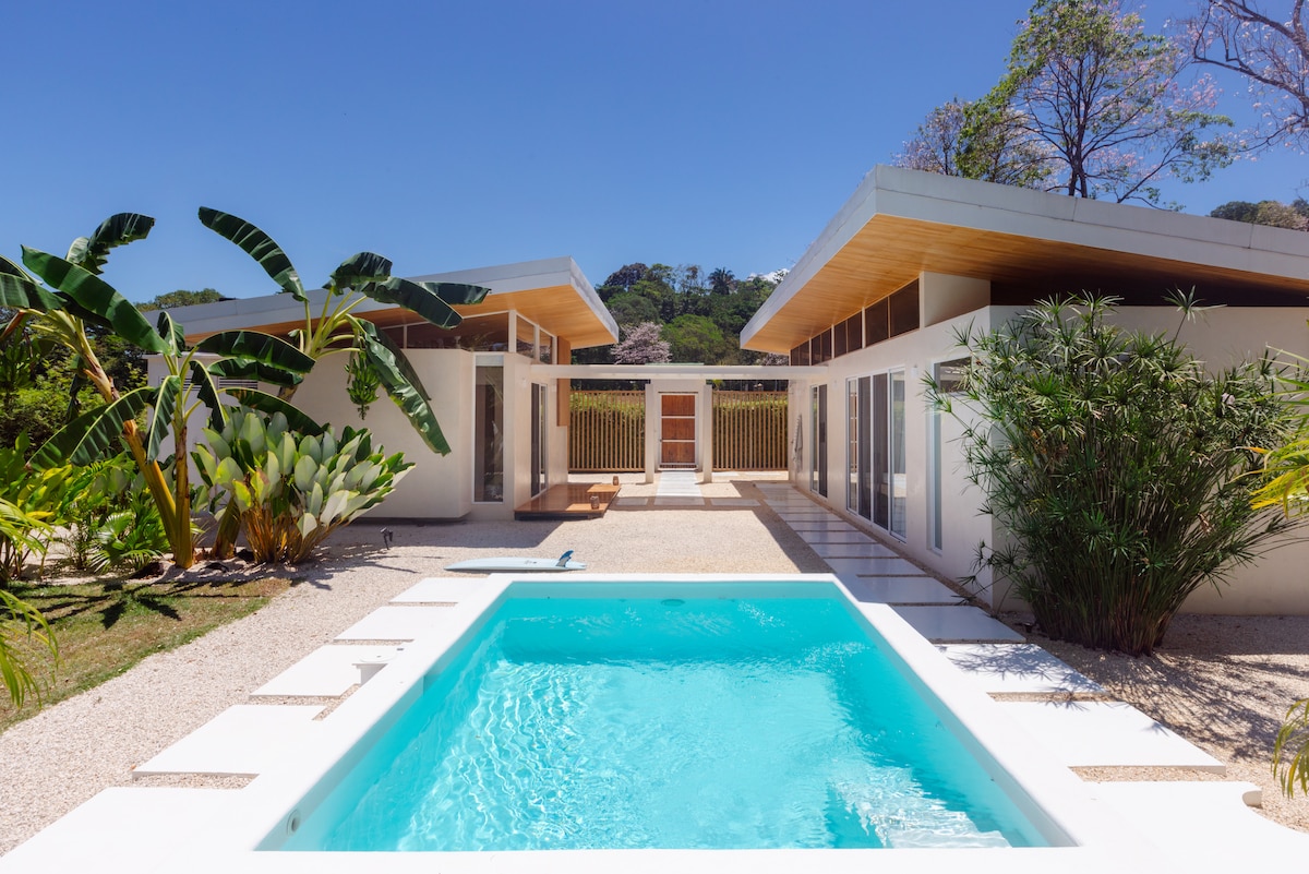 Modern Bungalow Across Street from a Secluded Beach. Quality Beds & Furniture (Teak/ Coco Bolo). Modern Kitchen & Bathroom, Quartz Counters & Stainless Appliances, Recessed Lights, 24" Tiled Floors. Lots of Amenities. You're Going to Love it Here! Located in between 2 Main Breaks. 10 Min in Either Direction. Walk to Rivers, Jungle Trails, Fishing, Swimming & more. TWO Fiber Optic WIFI Systems w/Battery BackUp. Digital Nomads Welcome. Potable, Hot H20, Fans in All Rooms, AC! On Site Mgmt.