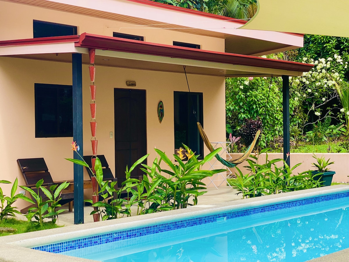 -TWO minute walk to the beach - Four charming bungalows centered around an inviting pool - Quiet location near all amenities - 200m from the top of the world class point break - Refreshing waters of the Rio Claro is only 150m away - 5-10 minute walk to center of town with restaurants and grocery stores - Pool and outdoor shower - Covered outdoor kitchen and BBQ area - Fully equipped modern kitchen - Ice cold A/C and wifi with UPS backup -Toucans and other wildlife abound