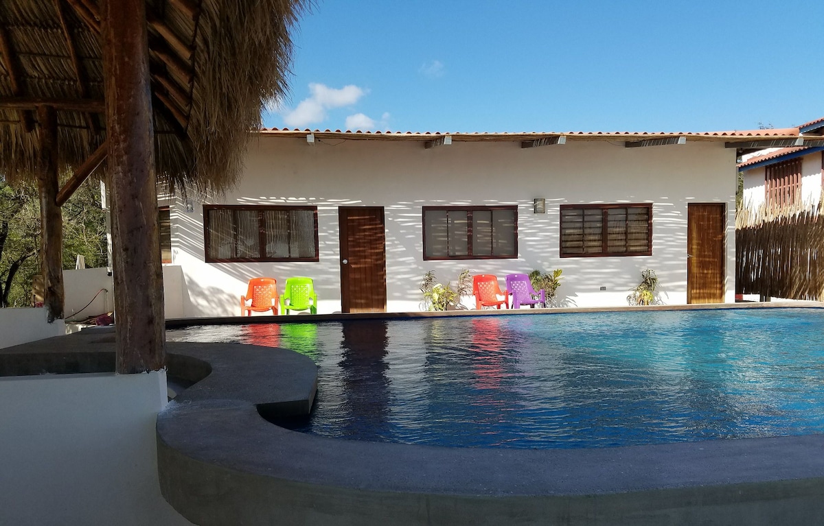 PRIVATE BEACH CABAÑAS (mediterranean style) with its own KITCHEN, FRIDGE and BATHROOM, double bed with an optional extra bed, so perfect for 1 person, a couple or group of 3. Situated 2 min walking to the beach, between SANTANA and POPOYO beach. Walking distance to some of the best surf spots in NICARAGUA. Common area includes POOL, BBQ and hammocks to chill out. We have WIFI, motorbike with racks and surfboards rental, surf guiding service so you can score the best spots in the area.