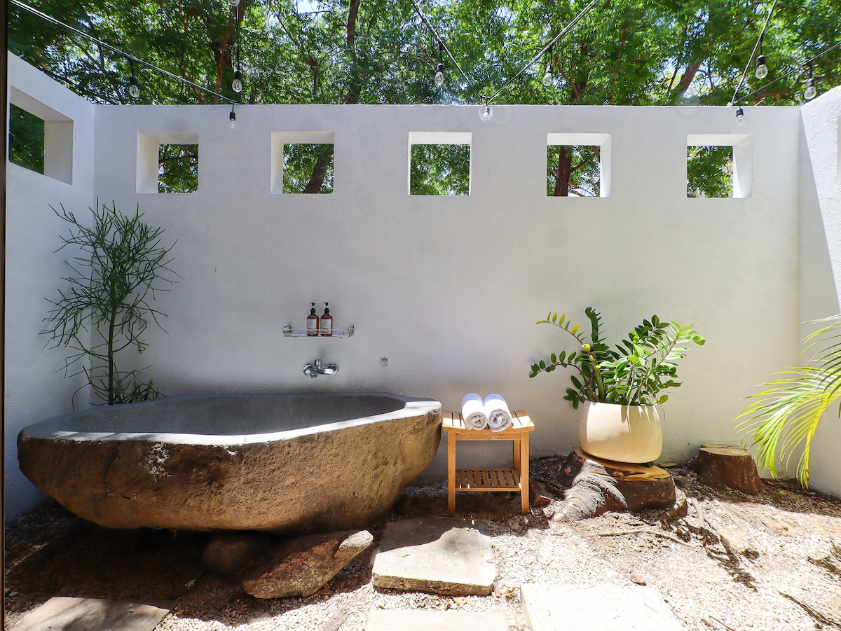 Immersed in nature, this is a brand new stylish and modern unit. Detailed with an exclusive rustic touch, we offer a unique dine and wine experience in our magical treetop terrace. Located downtown, yet in a quiet neighborhood, you will find yourself 5 minutes away (walking distance) from the pristine beach of Tamarindo. 2BR / 2BA, AC, fully equipped kitchen, terrace, outdoor treetop dining experience, free parking on premises. Take it easy at this unique and tranquil getaway.