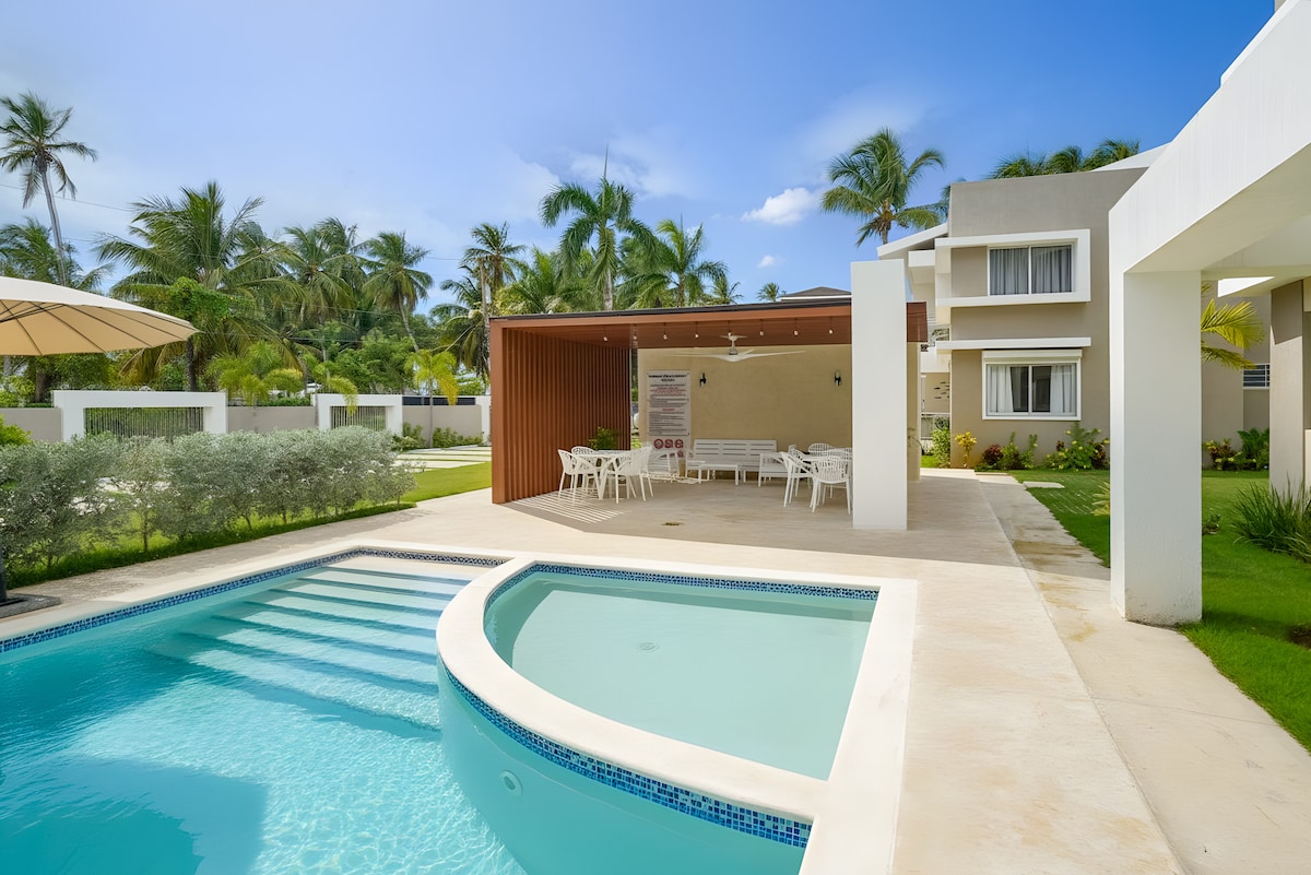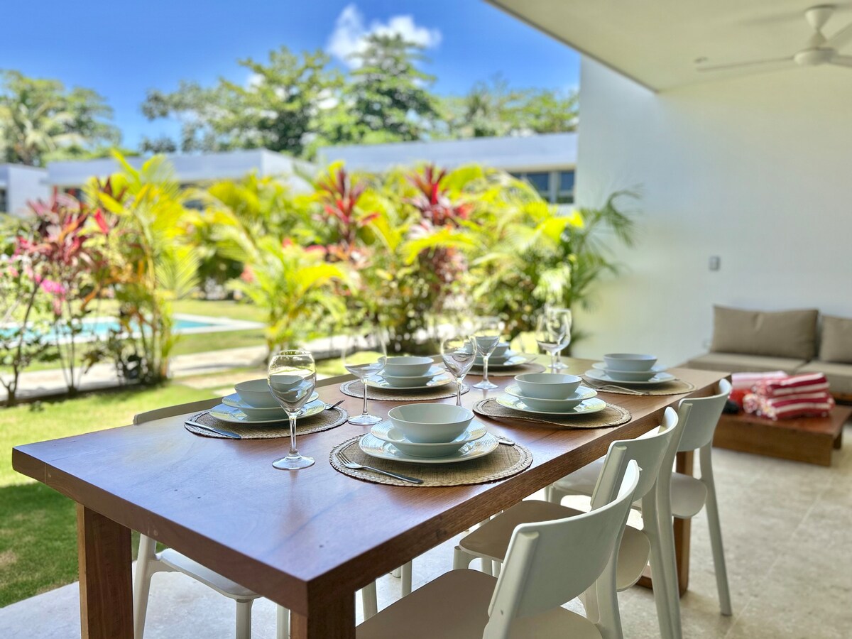 Welcome to our newly renovated 2-bedroom, 1-bathroom apartment in the heart of Punta Popy, Las Terrenas. Steps from pristine beaches and vibrant restaurants, the beach is right in front of the complex. Details: -Bedrooms: 1 king & 1 queen-size bed, A/C, ceiling fans, and Roku TVs. Night lamps with USB-C and USB ports. -Kitchen: Fully equipped for all your meal prep needs. -Dining: Cozy indoor dining for four; outdoor area with sofa and four-seat dining table. -Internet: 200mbps