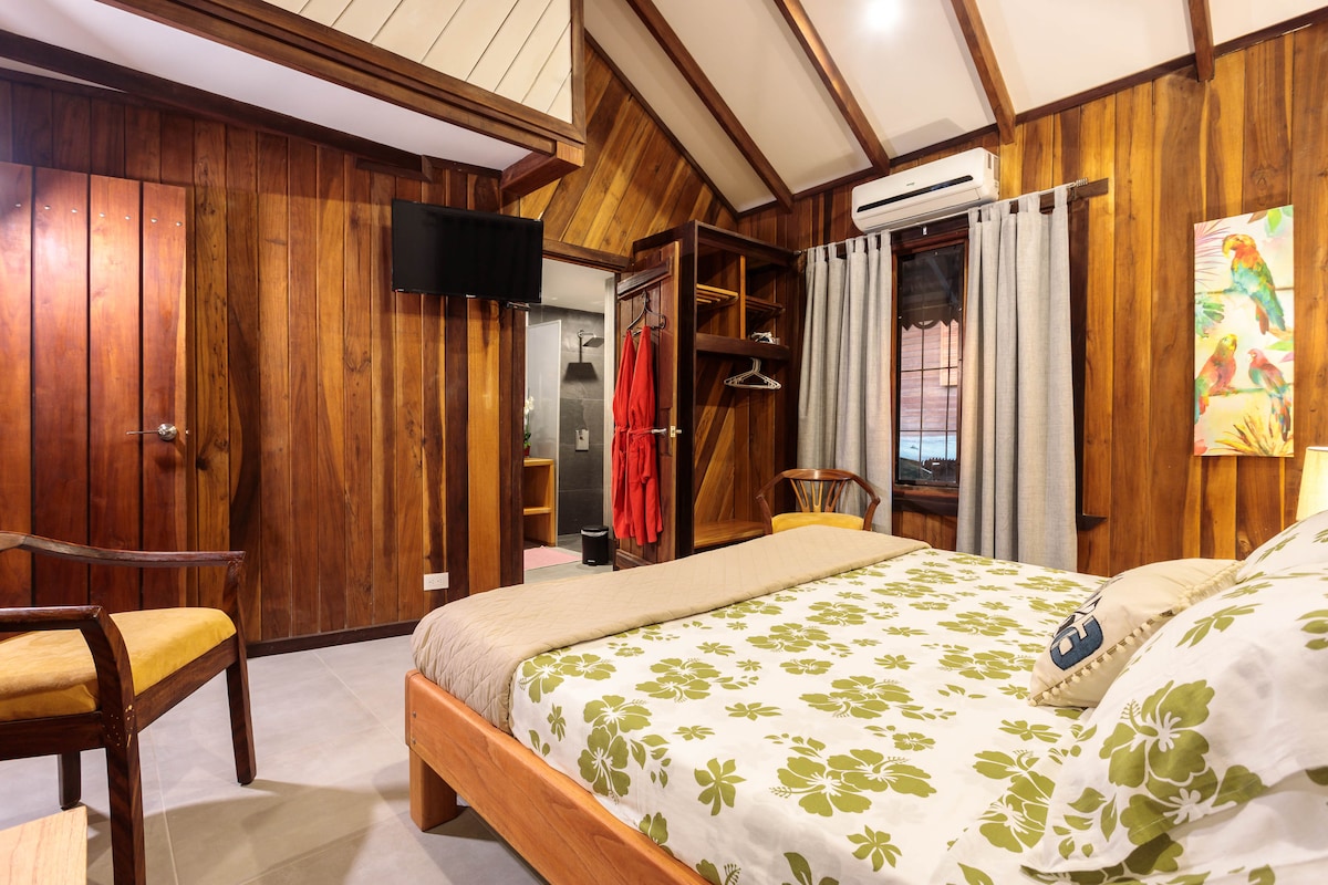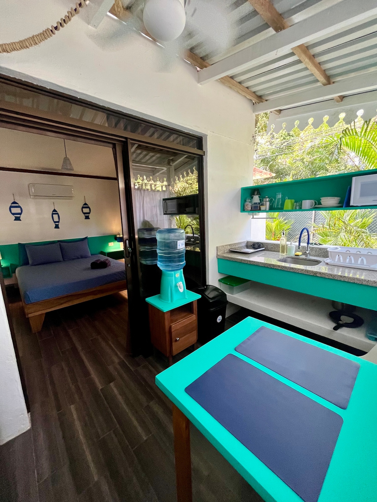 La habitación tiene cama queen, Aire acondicionado, televisor con firestick para acceder a servicios de streaming con tu cuenta propia(no tv cable) y baño privado. La cocina pequeña privada cuenta con lo necesario para hacer comidas sencillas. Ubicado en playa chiquita, frente a carretera principal, 300 mts de la playa y supermercado, 4 km de Puerto Viejo centro y 2 km de Punta Uva. Cuenta con parqueo privado. Orgullosamente Costaricenses🇨🇷