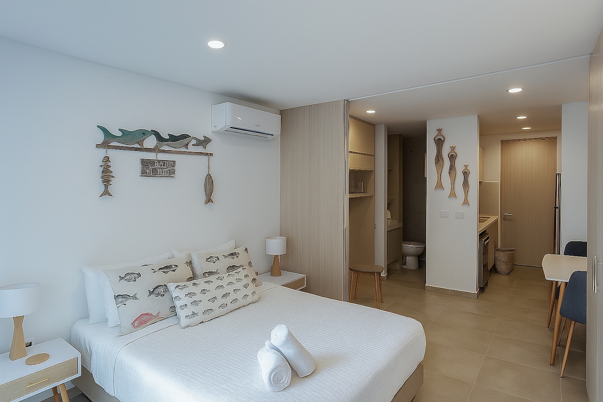 Your perfect getaway just 300m from the beach! Enjoy this modern studio apartment, just 5 minutes by car from El Rodadero. It features: 🛏️ Bedroom with a King bed, Smart TV, A/C, and blackout curtains 🛋️ Living area with sliding door for extra privacy 🍽️ Fully equipped kitchen for your convenience 🧺 On-site Laundry Service available 🛒 Minimarket in the building with essential groceries Book now and enjoy a great experience!