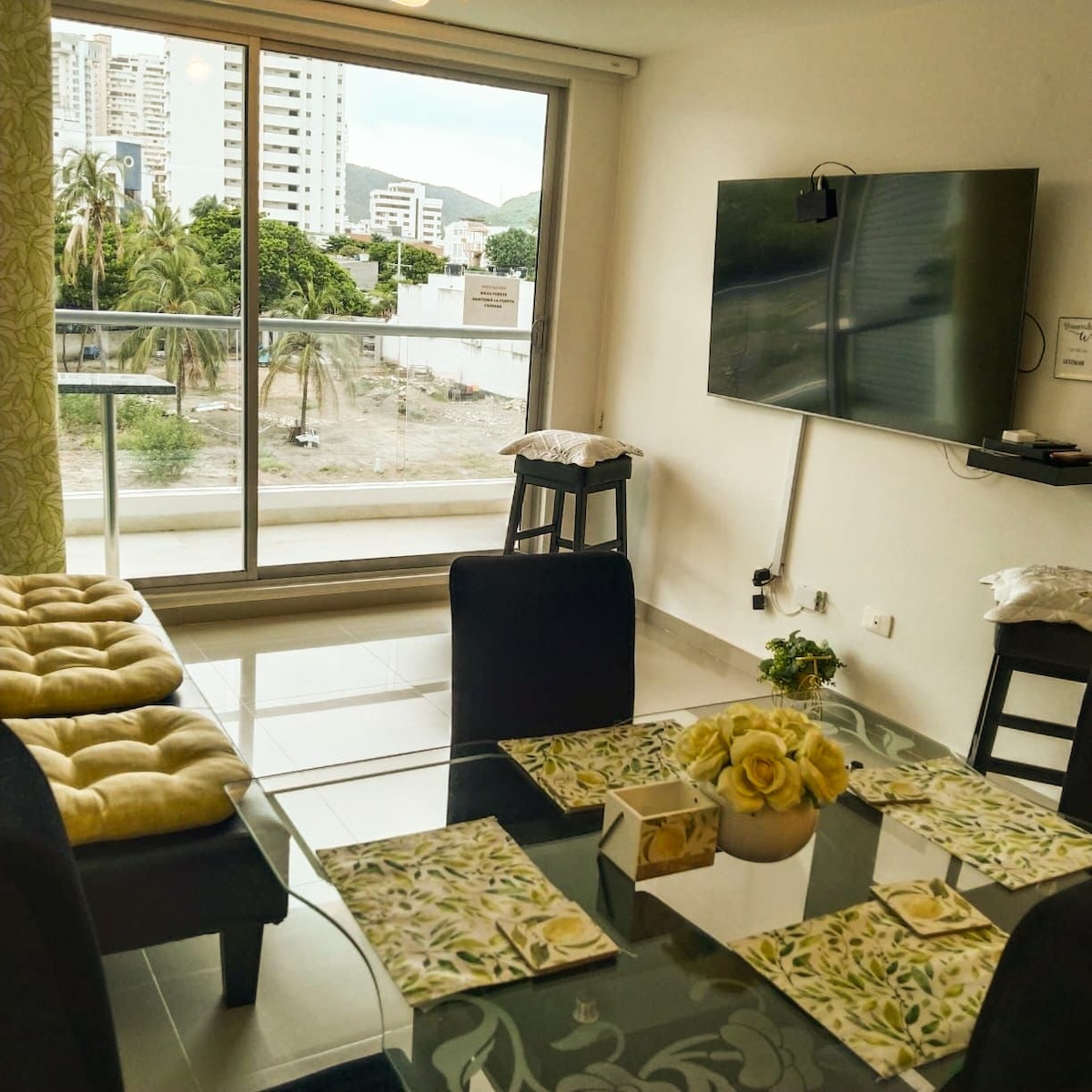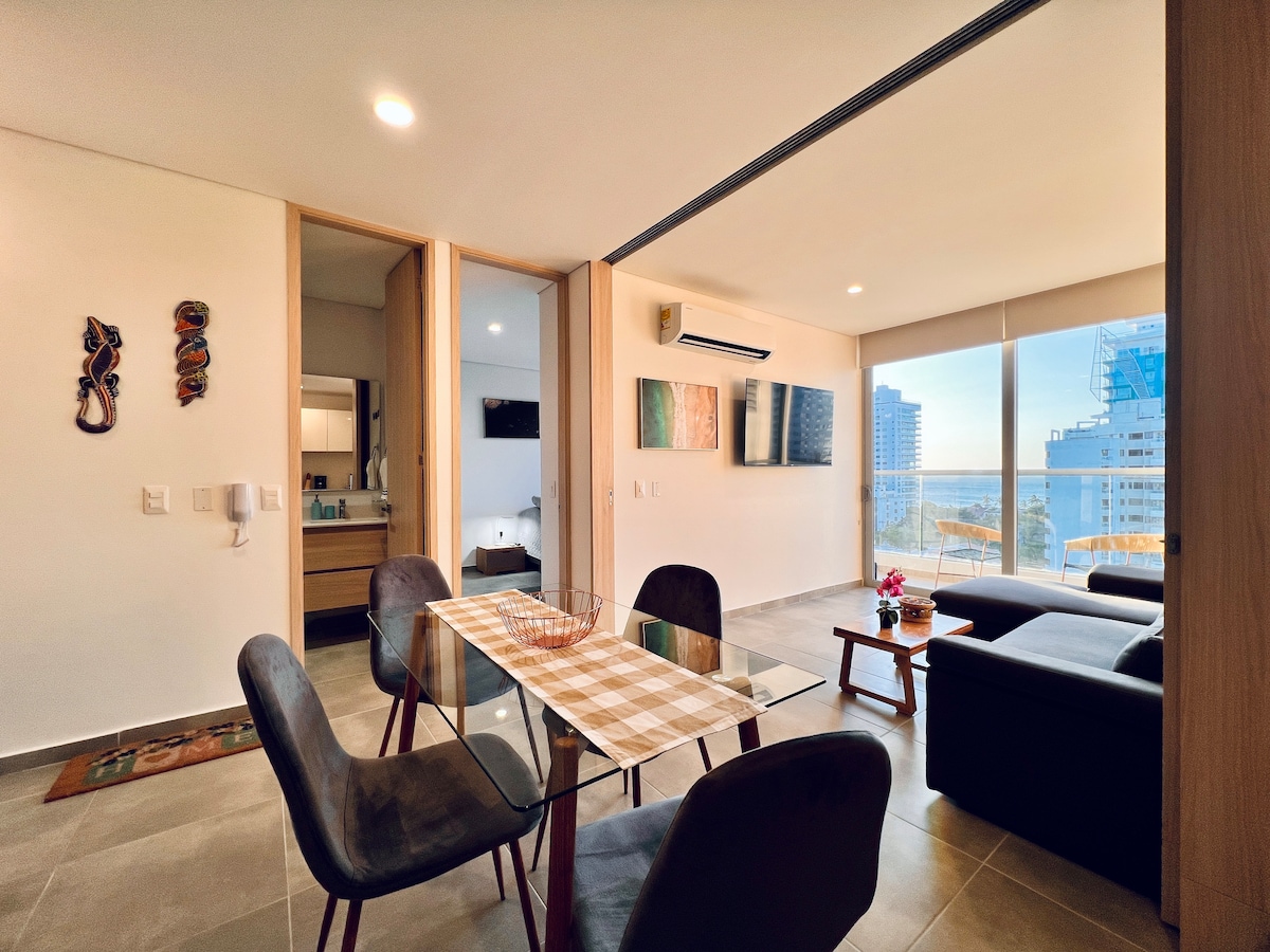 Your perfect getaway just 300m from the beach! Enjoy this modern studio apartment, just 5 minutes by car from El Rodadero. It features: 🛏️ Bedroom with a King bed, Smart TV, A/C, and blackout curtains 🛋️ Living area with sliding door for extra privacy 🍽️ Fully equipped kitchen for your convenience 🧺 On-site Laundry Service available 🛒 Minimarket in the building with essential groceries Book now and enjoy a great experience!