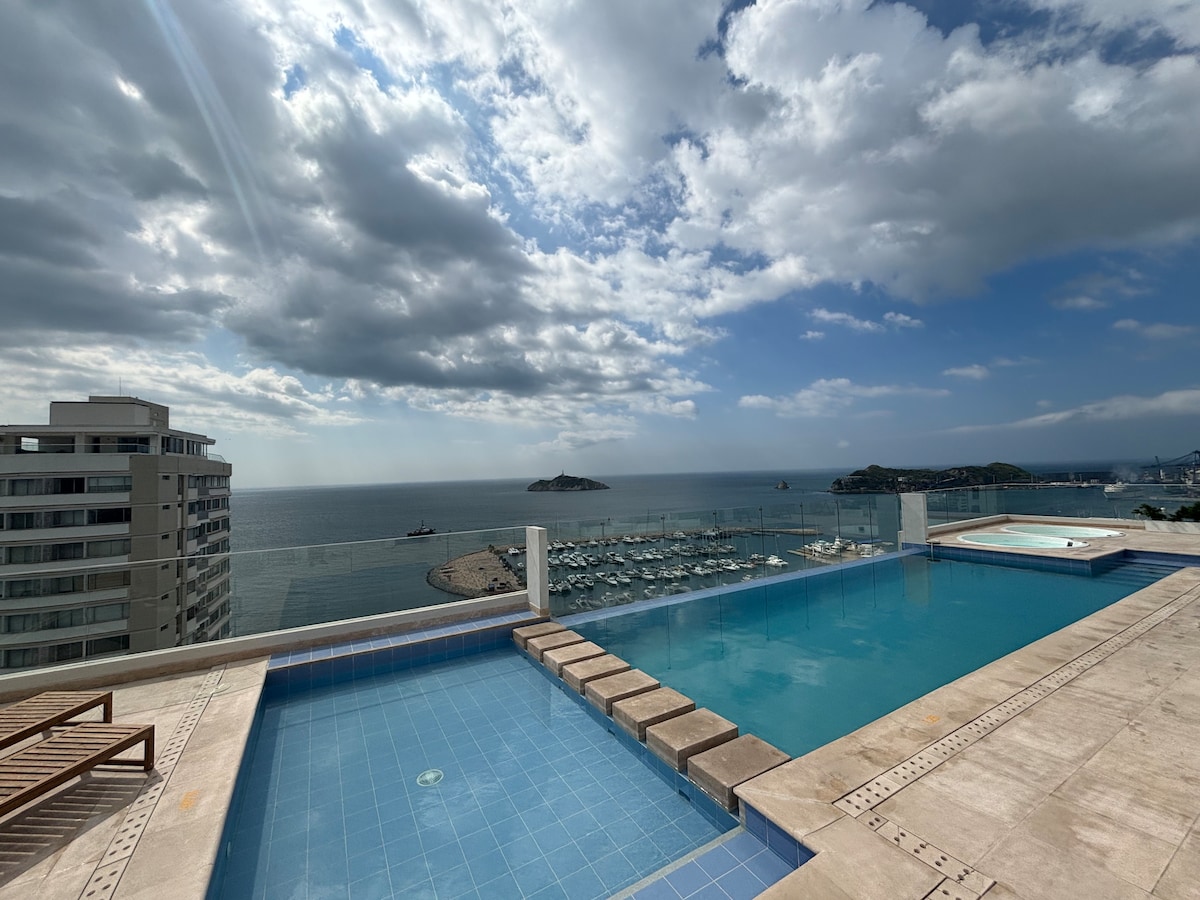 Discover the perfect balance between adventure and relaxation in this new apartment! With stunning views of the beach and mountains, just minutes from the historic center, it offers the ideal getaway for families, business trips and couples seeking luxury and comfort. Enjoy the pool, work area, Spa, squash court, laundry and all the amenities for an unforgettable stay. It is necessary to pay a manilla worth 50 thousand COP per guest.