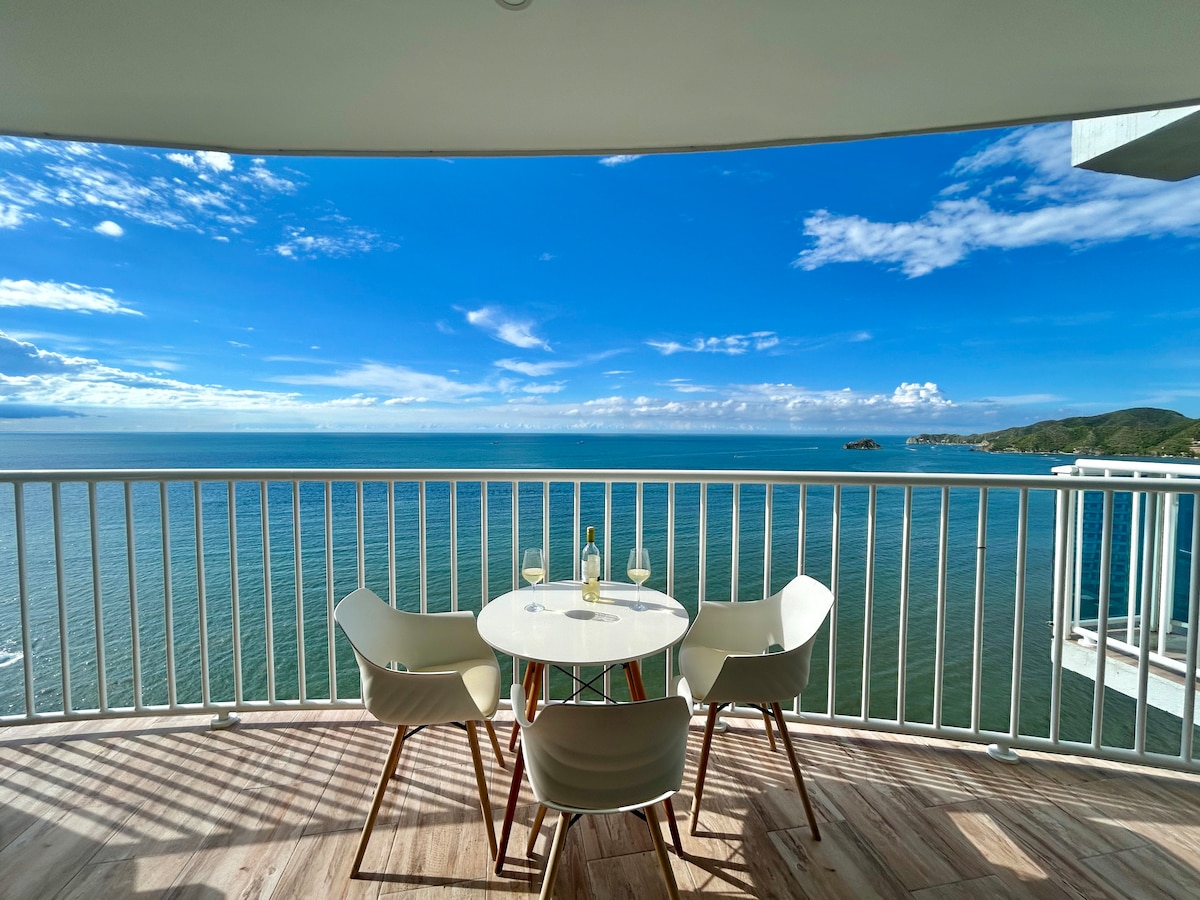 Espectacular apartamento moderno para estrenar en un piso 17 con vista al mar y salida directa a la playa. Espacio agradable para tomar vacaciones, descansar y/o trabajar home office. A 10 minutos del aeropuerto internacional y del centro histórico de Santa Marta, cerca a zona de restaurantes, bares, centros comerciales y farmacias. A menos de una hora del Parque Nacional Tayrona, Taganga, Minca. El apartamento cuenta con un amplio balcón donde podrás disfrutar del mejor atardecer de Colombia.