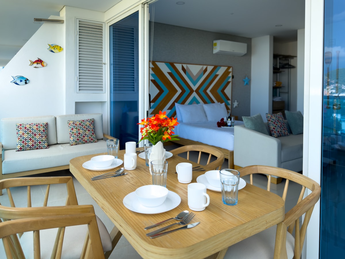 Enjoy this space meticulously designed with luxurious furniture and a clever layout, creating an feeling of spaciousness in its 35 square meters. It boasts all the amenities, 500Mb WiFi, A/C, Hot water, washer, dryer, coffee maker, luxurious water filter and dispenser, fully equipped kitchen, hair dryer, soap, shampoo and conditioner dispensers, double bed, sofa bed, dining table, private security and a breathtaking view of the sea, which greets you as you wake up. Perfect for families .........