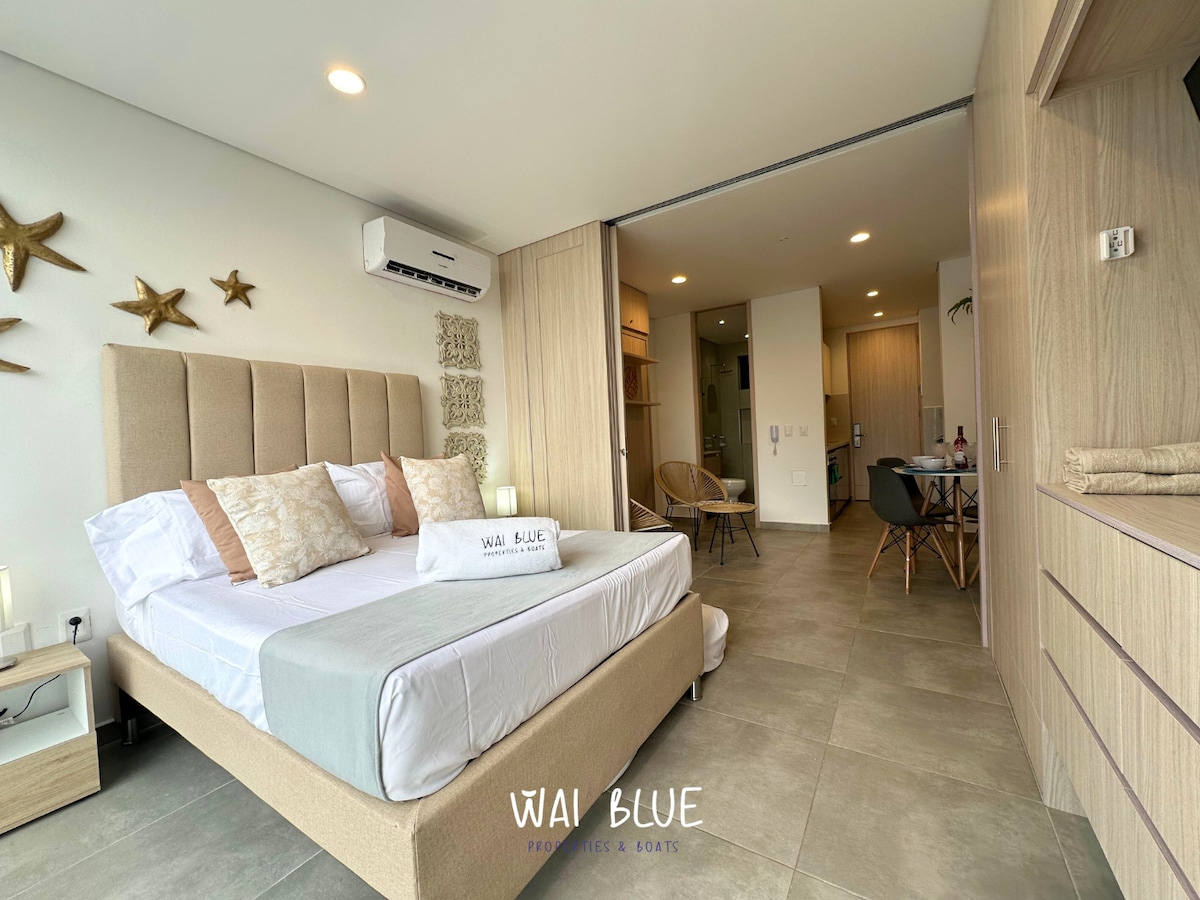 Moderno apartamento tipo loft con vista al mar a solo 100 metros de la playa en el Rodadero. Perfecto para 1-3 huéspedes con cama amplia, sofacama, cocina equipada, espacio dedicado para trabajar y baño de diseño moderno. Incluye increíbles amenidades: piscinas para adultos y niños, gimnasio completo, sauna y zona de BBQ. WiFi de alta velocidad incluido. Ubicación privilegiada cerca de restaurantes, zona comercial y atracciones turísticas. ¡Tu escape perfecto en el Caribe colombiano!