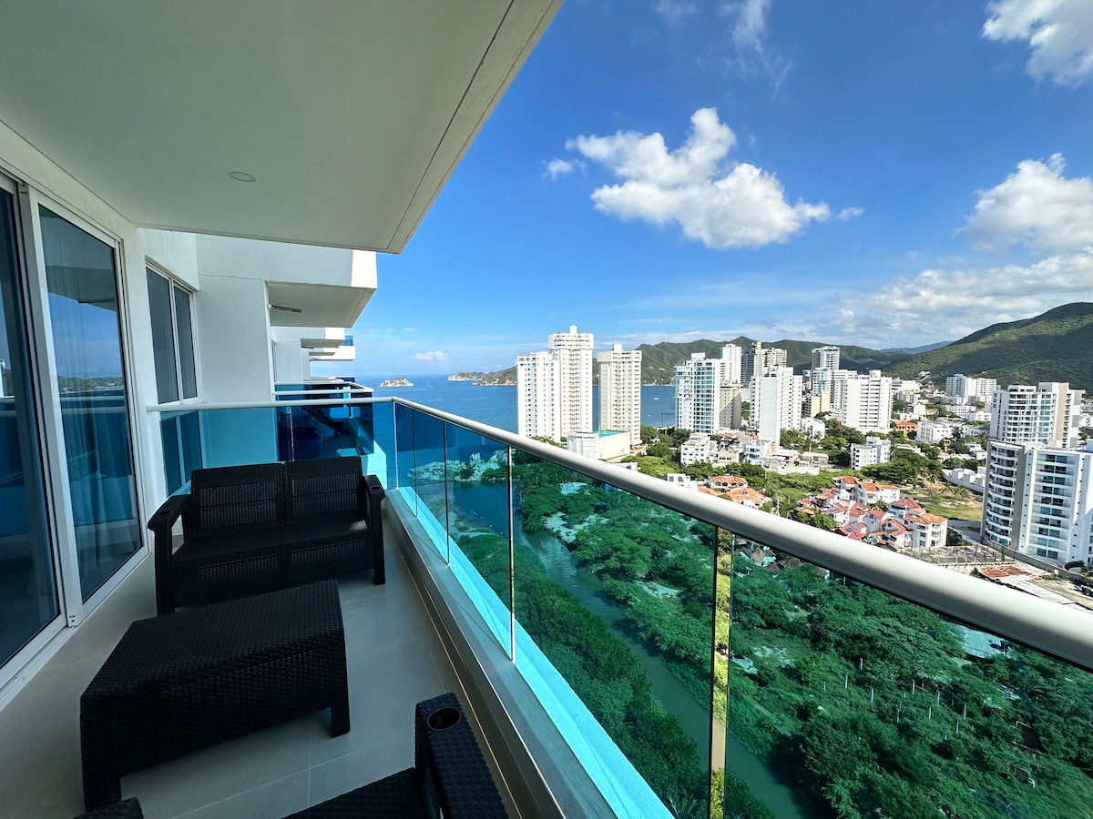 Disfruta un apartamento de lujo en la zona preferencial del Rodadero a tan sólo 15 minutos del aeropuerto internacional Simón Bolívar y a 10 minutos a pie del Rodadero, cuenta con salida privada a la playa, club de playa, zonas verdes con senderos ecológicos, terraza panorámica con zonas húmedas (Jacuzzis, bares, varias piscinas para adultos y para niños) entre otras amenidades como cancha de microfutbol, gimnasio, ping-pong, entre otras de estilo Resort para su disfrute.