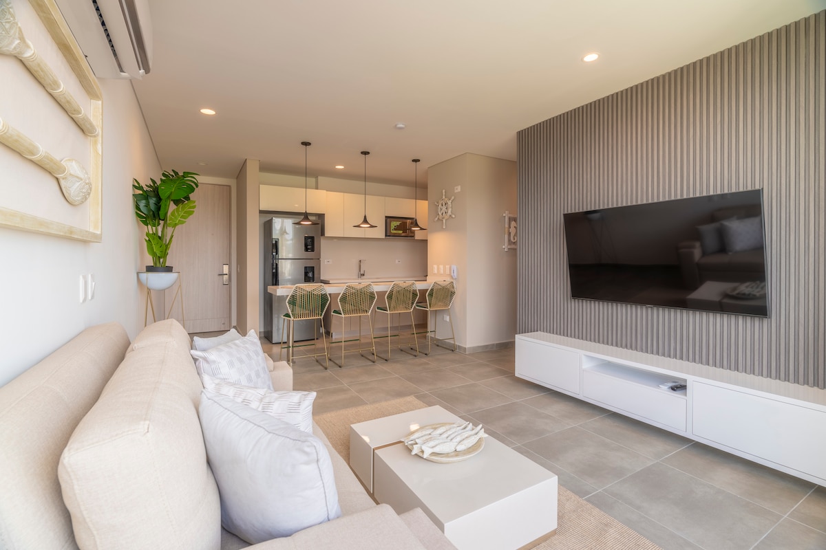 Modern Getaway Near the Beach Welcome to our stylish apartment, just 300m from the beach and 5 min by car from El Rodadero. Relax in a queen bed, Smart TVs, AC, and blackout curtains for a restful sleep. Sofa beds add extra space, and the fully equipped kitchen has everything you need. 🚗 Assigned parking for your peace of mind 🏝️ Enjoy beachside tranquility & explore local spots 🛒 Minimarket in the building for essentials Book now for the perfect stay!