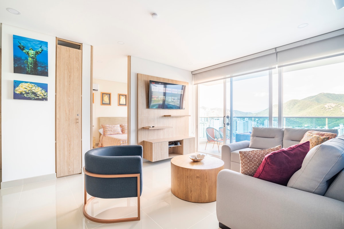 Espectacular apartamento moderno para estrenar en un piso 17 con vista al mar y salida directa a la playa. Espacio agradable para tomar vacaciones, descansar y/o trabajar home office. A 10 minutos del aeropuerto internacional y del centro histórico de Santa Marta, cerca a zona de restaurantes, bares, centros comerciales y farmacias. A menos de una hora del Parque Nacional Tayrona, Taganga, Minca. El apartamento cuenta con un amplio balcón donde podrás disfrutar del mejor atardecer de Colombia.