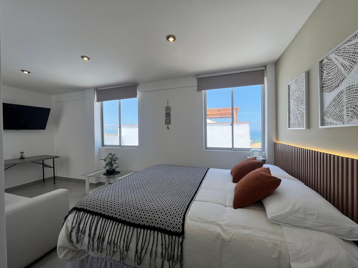 ¡Despierta con el sonido de las olas! Una estadía relajante en este acogedor monoambiente frente al mar, ubicado en el primer piso con acceso directo a la playa. Equipado con una cama queen y un sofá cama, cuenta con cocina completamente equipada, baño privado, Wi-Fi y un proyector para que puedas ver tus series favoritas en Netflix. El espacio es perfecto para descansar, correr buenas olas, trabajar con vista al mar o simplemente desconectarte. -Cama queen y sofá cama de plaza y media.