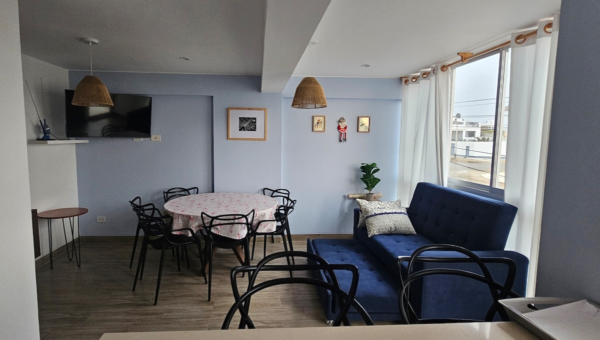 Amplia terraza con espectacular vista al mar desde todos los ambientes. En primera fila, bajas las escaleras y estás en la playa. Full equipado, vajilla, internet, 2 tv con cable, 5 camas, cochera cerrada. Uso exclusivo de todo el departamento. Te sentirás seguro y tranquilo. Cerca a parque, mercado, restaurants, bodegas. Hermoso malecón para agradables paseos en ambiente familiar. Petfriendly. Sólo lleva tus toallas y artículos personales! No tenemos parrilla pero puedes llevar la tuya.