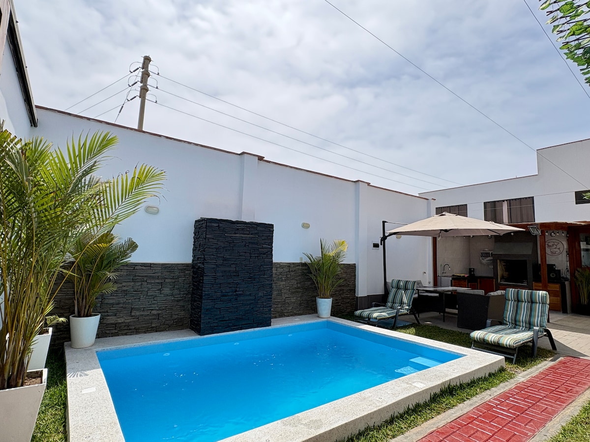 Relájate con familia y amigos en esta acogedora casita. Se encuentra a 5 minutos en auto de la playa San Bartolo o de la Playa Pocitas y a 10 min caminando de la playa El Reves. Piscina disponible. Cuenta con servicios básicos, wifi, y un amplio jardín de más de 50 metros cuadrados, parrilla y juego de sapo. TV en sala y dormitorio principal ( fire tv). Solo se admiten mascotas previa validación del anfitrión.