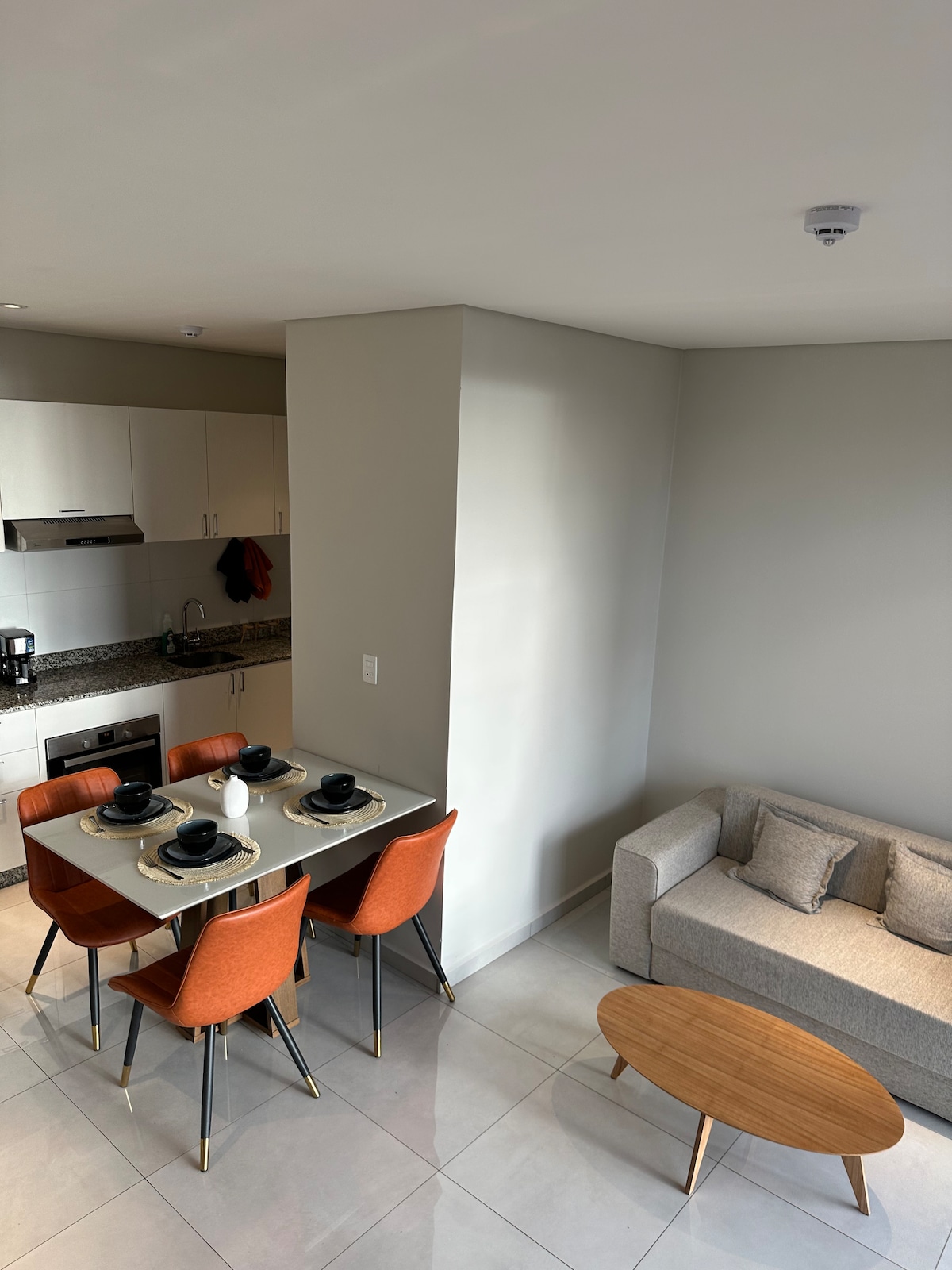 Apartamento con balcón vistas al río y excelente ubicación!📍. A pocos pasos de la Costanera, Playa San José🏖️, restaurantes🍴 y de Shopping Costanera 🛍️. Habitación principal con cama matrimonial 🛏️, sala con sofá cama(2.10 x 0.95 x 0.92) 🛋️, comedor, cocina integrada y baño moderno 🚿 Seguridad 24/7 🔒 y servicio de lavandería dentro del edificio para tu comodidad. Aires Splits en habitación y sala-comedor.