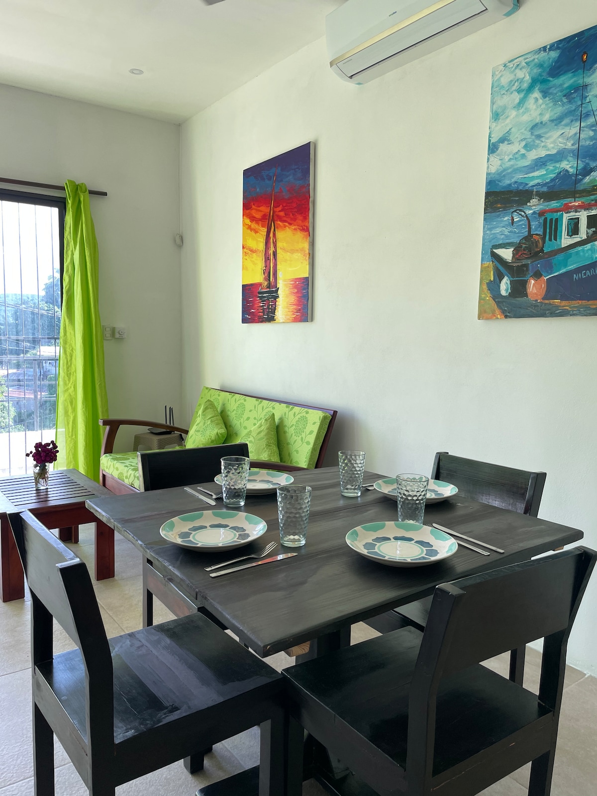 Chic, stylish studio located just steps from town and the beach! Condito Mapache is a new space located just on the edge of the town of San Juan del Sur. Decorated in handcrafted Nicaraguan furniture, and hand painted tiles from Granada, this spacious studio offers you everything you need to be comfortable on your stay in Nicaragua. Wifi, AC, smart TV, Juliette balcony, shared pool, stocked kitchen, washer/dryer and onsite pizza parlour are just some of the perks of this sweet little space!