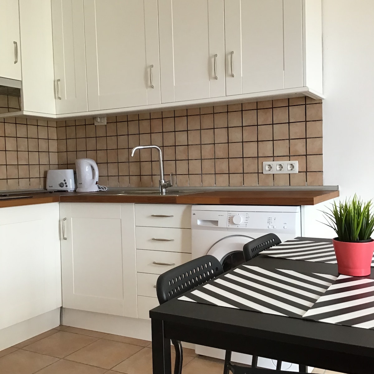 Enjoy a stylish experience at this centrally-located, 5 min to the beach place. Cozy, luxurious and quality furnished apartment can accommodate 3 or up to 4 persons (2 adults, 2 children). A double bed in the bedroom and a sofa in the living room. Terrace with morning sun for coffee. Kitchen with all the equipment you might need for cooking - oven, dishwasher. Air conditioner. Close to shops, bars, restaurants, playgrounds and bus stop
