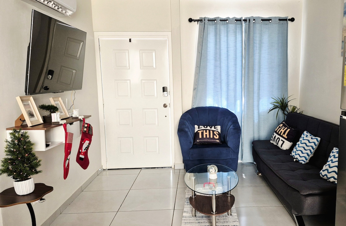 Villa a menos de 4 minutos a pie de la playa Las Hojas y su palmeral. Disfruta de piscina privada, internet Starlink, 2 habitaciones con cama de matrimonio/king, 1 baño, sofá cama, parking privado, agua caliente, aire acondicionado, cocina equipada con vitrocerámica, campana y nevera grande, lavadora, equipo de sonido, TV, y caja fuerte. Incluye carrito-mesa y sillas para la playa. Ideal para familias, parejas o teletrabajo en un entorno tropical con todas las comodidades. A 35 m del aeropuerto.