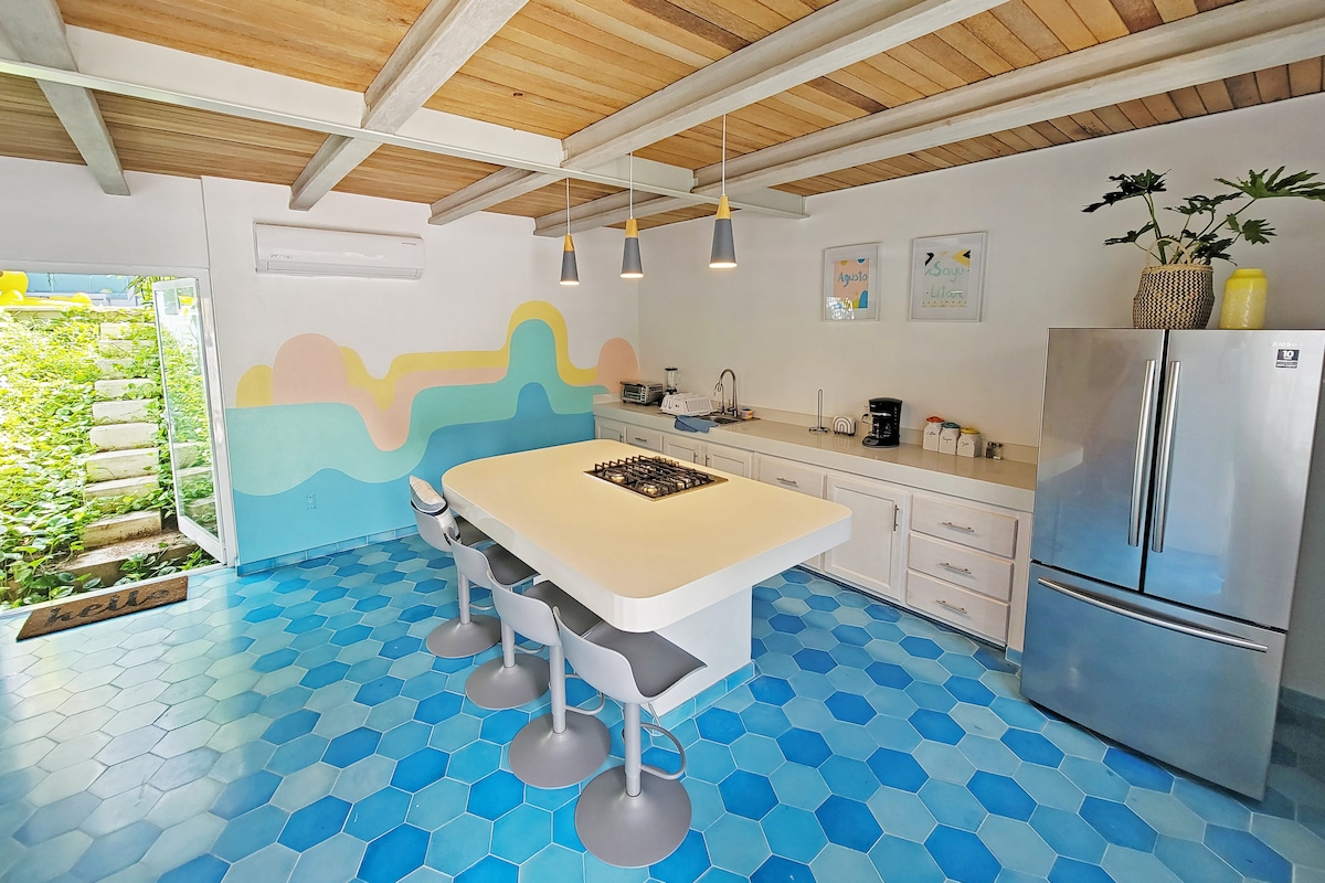 Casa La Bodeguita consists of two levels of living space overlooking open space and coconut palm trees. The home offers two bedrooms, each with a queen size bed. The bathroom features a large vanity with a natural stone shower. The kitchen provides all the essentials and wood cabinetry. The first floor lower terrace has a granite top table for four along with a cool plunge pool. The second floor roof terrace has a wet bar, a table for six, gas grill, and lounge chairs.