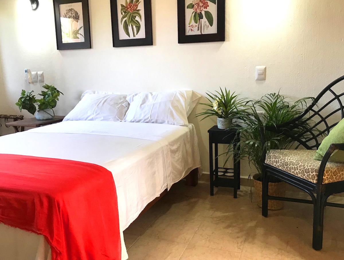 Esta hermosa habitación es ideal para parejas o para darse una escapada de descanso en solitario. Contamos con 3 habitaciones de esta categoría en Casa Ritual; una en la planta baja y dos en el primer piso. La habitación cuenta con una cama queen size, pantalla plana con netflix, aire acondicionado, ventilador de techo, escritorio y silla por si vienes a hacer home office, vista a una calle tranquila y arbolada y un baño muy original. Ven a relajarte con nosotros y déjanos consentirte!