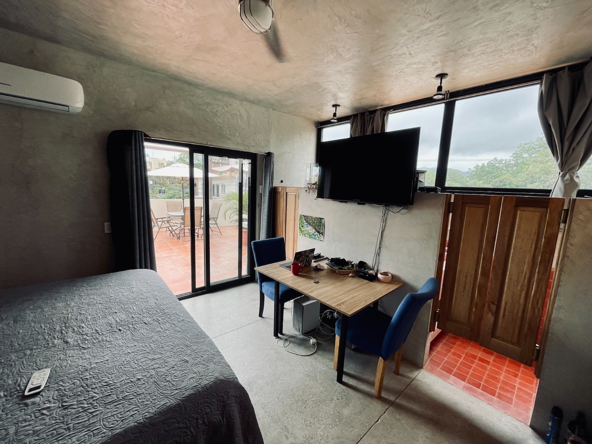 RUSTIC OPEN AIR PALAPA loft; unbeatable views; No AC or screens; tropical jungle. 2 min walk to wide tranquil beach. Beach chairs/umbrella, Wifi, maid, safe, shared jacuzzi dipping pool, security cameras, LR, bar, kitchenette, bath/shower, 2nd upper loft, resident cats. Queen bedroom. Mosquito net, fans, ocean breeze, bug spray. 6 min. walk beach or street to restaurants. If sensitive to insects consider Calabaza's Africa Suite with AC, screens and doors..