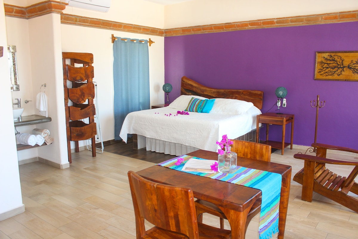 Studio Cuiza is perfect for a couple with a Queen size bed, kitchen, AC, Balcony and more. But we can add a single futon bed very comfortable, for 1 more person in this Studio for a small fee. Studio Cuiza is on the 3rd floor of our building and just a stair away from the rooftop, pool w ocean view and palapa. from balcony you can enjoy Mountain and town view and Morning light.