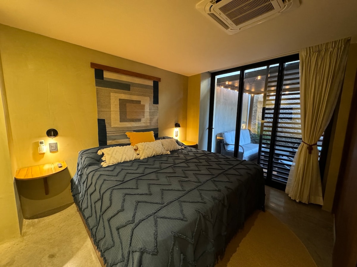 This Boho-Contemporary condo features open floor plan flooded with natural light, fresh air and ample space with front and back balconies. Guests can enjoy the amazing shared rooftop terrace and salt-water dipping pool, lounge area and 360 views. In the heart of the North Sayulita neighborhood with easy walk to the beach, coffee shops, restaurants and the center. GREAT location! Never miss one of Sayulita's famous sunsets. Designed by renowned Arq. Estela Gayosso. *Food or drinks not included.