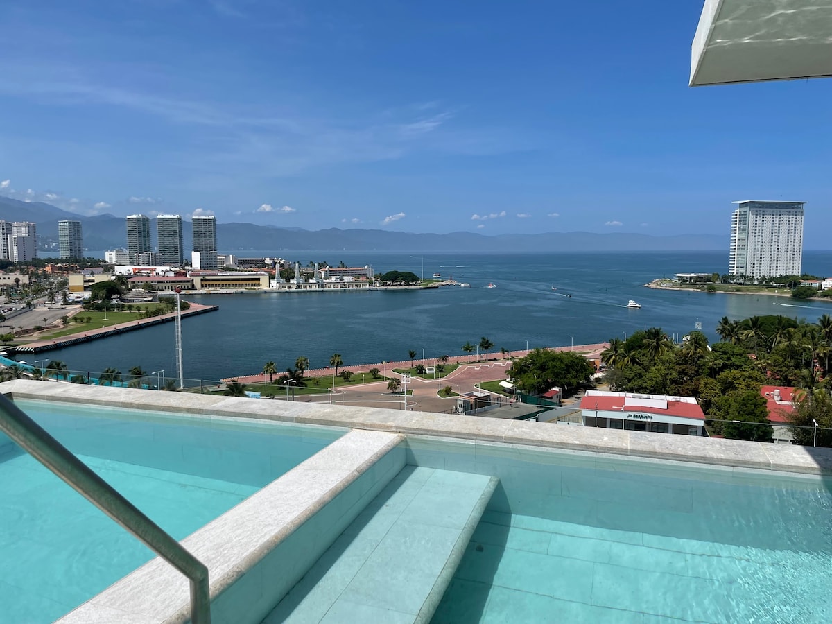 Welcome home to your MODERN 7th FL condo. Your Rooftop infinity pool w/ a BREATH-TAKING VIEW of the sea and cruise ships: simply stunning! Our space offers all the convenient amenities. Rooftop BBQ or gym with a view? You got it! All in a perfect location; only a 12-min walk to the beach, restaurants, bars, groceries, malls, cinema, and hospital. The Malecón, Romantica, and Marina are a quick 10-min drive away! YOUR dream getaway with stunning rooftop views right here in beautiful PV.